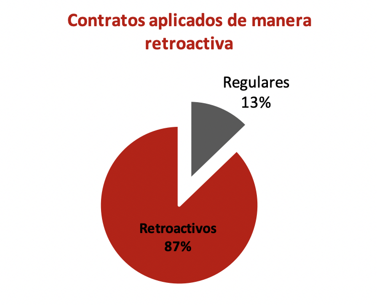Sin embargo, de acuerdo a la base de datos proporcionada por el Ministerio de Trabajo mediante orden judicial, un 87% de los contratos emergentes fueron aplicados de manera retroactiva, es decir la reducción de jornada (y en consecuencia de remuneraciones) se habría estado aplicando por días y meses antes de su notificación. Ello habría afectado a 57.139 trabajadores. Solamente 8.396 notificaciones se habrían realizado de manera regular.