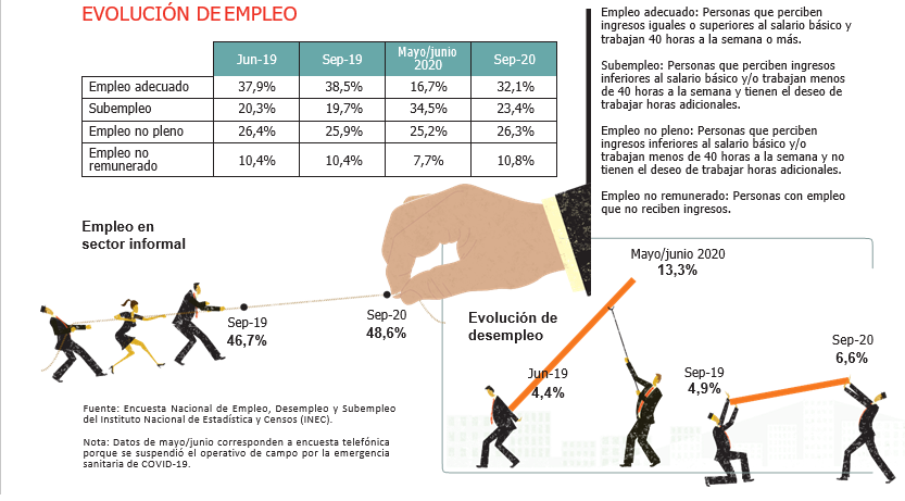 La pandemia golpeó el mercado laboral: empresas con menos capacidad para sostener plazas de trabajo, desempleo, informalidad y trabajadores con menos poder adquisitivo. El análisis laboral de 2020 tiene como factor principal la pandemia de COVID-19. El golpe a la economía nacional se refleja en los índices laborales. Según la última Encuesta Nacional de Empleo, Desempleo y Subempleo del Instituto Nacional de Estadística y Censos (INEC), la tasa de empleo adecuado a septiembre es de 32,1%, mientras que en el período anterior fue de 38,5%. Es decir, hay menos personas con un empleo que les garantice un salario igual o superior al básico. El subempleo (categoría donde las personas ganan menos que el salario básico) aumentó de 19,7% en septiembre de 2019 a23,4% en septiembre de 2020. Mientras, el desempleo aumentó de 4,9% a 6,6%.