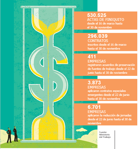Con el confinamiento de dos meses en la etapa más crítica de la pandemia (marzo y abril) y las restricciones para evitar la propagación de COVID-19, que afectaron a la capacidad productiva de las empresas, hubo una ola de despidos en el país. El Ministerio de Trabajo registra 530.525 actas de finiquito desde marzo hasta noviembre; sin embargo, en el mismo período, hubo 296.039 nuevos contratos de trabajo que continúan vigentes.