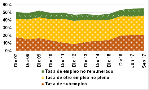 Este levantamiento se realiza desde el año 1987 en el extinto Instituto Nacional de Empleo, en sus orígenes se manejó una periodicidad anual y desde 1993 la maneja el INEC. A partir de diciembre de 2003 se la modifica y se la trabaja trimestralmente. Desde finales de los años noventa el Banco Central del Ecuador presentaba sus resultados de encuestas mensuales de empleo en las principales ciudades del país. Sin embargo, hace 10 años se comienzan a dar importantes cambios que modifican la forma de medir y sobre todo de interpretar los resultados. Es así como en diciembre de 2007 se revisa la metodología para incorporar cambios, en 2013 se migra al marco de muestreo 2010, en marzo de 2014 se incrementa el tamaño de la muestra y en septiembre se genera un nuevo marco conceptual de la Población Económicamente Activa (PEA). En junio de 2015 se realiza una actualización metodológica de la medición del empleo del sector informal. Todos estos cambios hicieron que se cuente con una serie de tiempo desde el año 2007 y desde ese periodo se hayan también modificado conceptos como subempleo, ocupación inadecuada, hasta los que manejamos en la actualidad. La situación de la economía ha tenido una importante relación con la del empleo adecuado. Este indicador se refiere a las personas que por lo menos perciben el salario mínimo, trabajan más de 40 horas a la semana (o menos pero no desean trabajar horas adicionales). Esta categoría es la que más se busca que concentre a la PEA. El valor más alto se alcanzó en diciembre de 2014 con 49,3% de la PEA, en tanto que durante la crisis del año 2009 descendió a 39,2% en diciembre de ese año. Al igual que el crecimiento de la economía, a partir del año 2015 este indicador desciende y, luego de una pequeña recuperación, se lo estima en 40,4% en septiembre de 2017. Evolución de la ocupación adecuada Fuente: INEC – Encuesta Nacional de Empleo, Desempleo y Subempleo Ante este escenario, el desempleo debería verse afectado, pero de acuerdo a las cifras oficiales no es el caso. Ya que este indicador no ha sido uno de los principales problemas del país. Es así como solamente en los resultados de diciembre de 2009 se alcanzó una tasa de 7%. Esta tasa se ubicó en 5% en diciembre de 2016 pero en el último dato, a septiembre de 2017 descendió a 4,1%. Evolución del desempleo Fuente: INEC – Encuesta Nacional de Empleo, Desempleo y Subempleo Esto hace que el problema se concentre en las formas de empleo que no son adecuadas ni son desempleo. Anteriormente, se manejaba una categoría subempleo, luego se planteó que el subempleo era una parte de la ocupación inadecuada y finalmente se manejan otras categorías. El subempleo es definido por el INEC como las personas con empleo pero que percibieron ingresos menores al salario mínimo y/o trabajaron menos de 40 hora a la semana. Estas personas tienen la disponibilidad y la intención de trabajar horas adicionales. De acuerdo a esta clasificación, el subempleo en el país es de 20,5% en septiembre de 2017, uno de los valores más altos. Es así como en el año 2011, esta tasa se estimó en 9% y, dada la compleja situación de la economía ecuatoriana, se ubica se incrementó a 20,5%, como se mencionó. El incremento de este indicador demuestra que en el Ecuador, al perder el trabajo se generan diversas formas de empleo no regularizadas, pero que permiten generar ingresos para los hogares. Sin embargo, existen otras clasificaciones que son ajenas al empleo adecuado. En esta línea se tiene el empleo no remunerado, que son las personas que trabajan pero no perciben remuneración, como trabajadores del hogar o ayudantes no remunerados. En septiembre 2017 esta tasa se ubicó en 10,1%, siendo el valor mínimo el 7,1% de diciembre de 2013 y 2014. La última categoría del INEC se denomina Tasa de otro empleo no pleno. Esta categoría agrupa a las personas que perciben ingresos al salario mínimo y/o trabajaron menos de la jornada legal, pero no desean trabajar más. Es así como de acuerdo a esta clasificación, en el mes de septiembre de 2017 el 24,7% de la población no tiene un empleo adecuado, pero no busca tenerlo. Este indicador es de gran importancia ya que es un porcentaje importante de la PEA de personas que por uno u otro motivo, están satisfechos con su condición laboral, a pesar de no cumplir con las condiciones de un empleo formal. Empleo no adecuado Fuente: INEC – Encuesta Nacional de Empleo, Desempleo y Subempleo La situación del empleo en el Ecuador es un reflejo de la compleja coyuntura que atraviesa la economía del país. No obstante, los cambios de metodología y conceptos han llevado a que se manejen distinta categorías, las mismas que permiten ver que en el país una reducción de la ocupación adecuada se traduce principalmente en subempleo, ya que la suma de ambos en el período analizado varía entre el 56% (2011 y 2012) y 61% (2007, 2015, 2016 y 2017), con un promedio de 59% en el período. No deja de llamar la atención que en el país cerca del 25%, a pesar de sus deficientes condiciones laborales, no busquen mejores oportunidades de trabajo. De todas maneras, es fundamental seguir trabajando en la implementación de políticas que fortalezcan la generación de fuente de empleo adecuadas. Fuente: EKOS. |