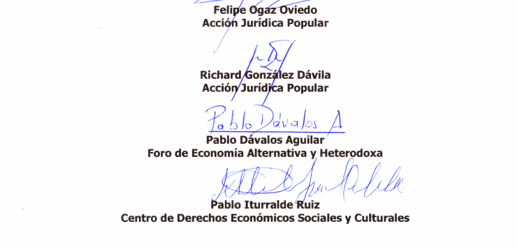 Firman: Acción Jurídica Popular, Centro de Derechos Económicos y Sociales- CDES, Foro de Economistas Heterodoxos.